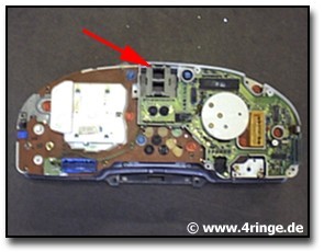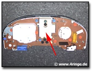 7.) Bordcomputer auf das Cockpit aufbauen und die Leuchtfelder (Pfeil) des Mini-Check in den Schacht einsetzten. Leuchtfelder evtl. mit ein wenig Klebstoff fixieren. |