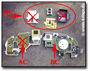 5.) Mini-Check (MC) zerlegen 6.) Auto-Check (AC) vom Bordcomputer (BC)abbauen Gestrichene Teile (X) werden nicht mehr gebraucht. |